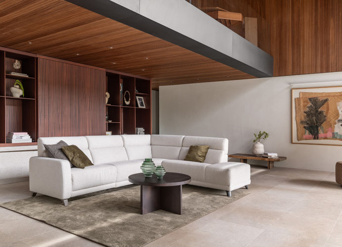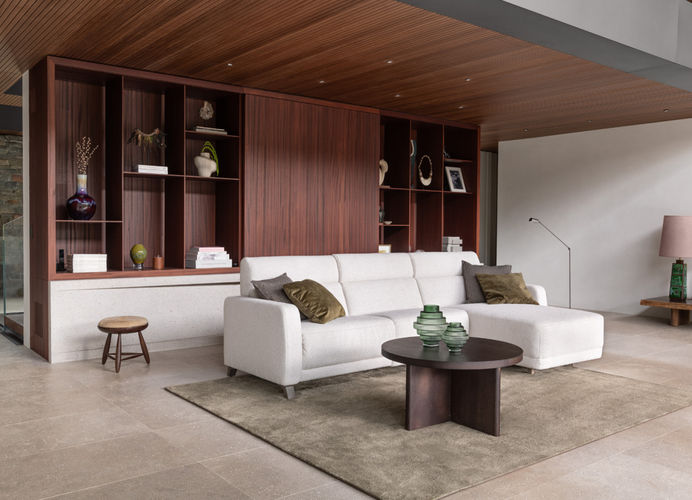 WE00868Salon Klara van Mecamgroup is het perfecte voorbeeld van hoe design en gezelligheid in balans kunnen zijn. Deze salon kenmerkt zich door architecturale lijnen en subtiele details, gecombineerd met zachte, uitnodigende volumes.