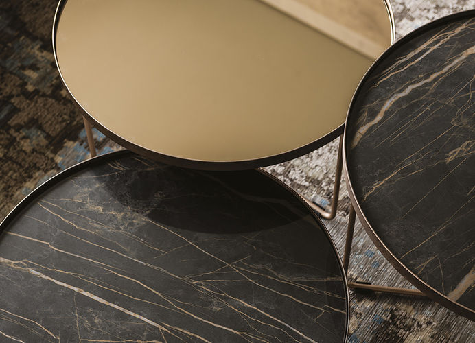 Het verfijnde samenspel van materialen — van luxueus keramiek en elegant spiegelglas tot warm hout — zorgt voor een rijke en stijlvolle uitstraling. De handgemaakte Brushed afwerking geeft elke tafel bovendien een extra exclusieve touch.