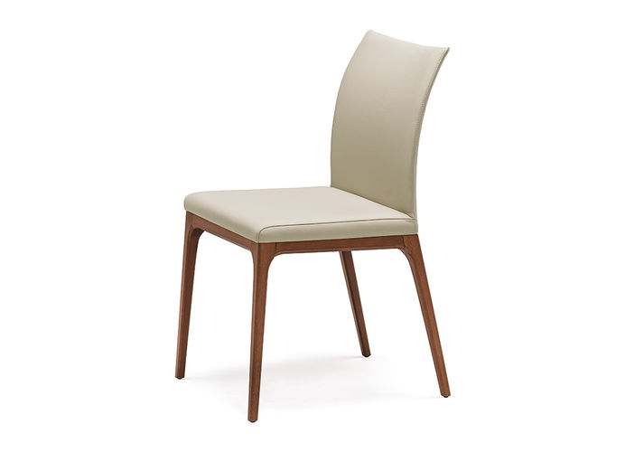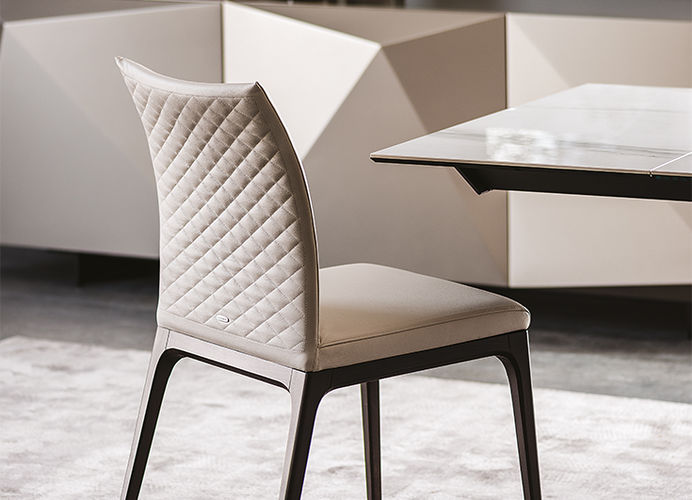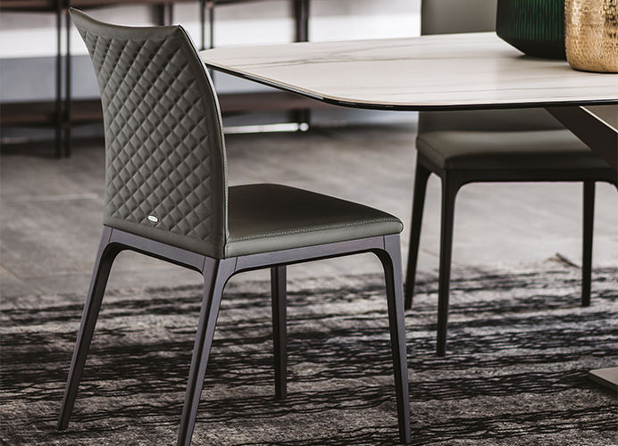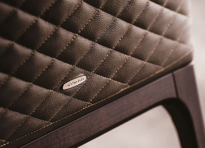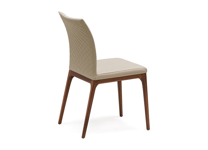 De rugleuning in zacht leder is afgewerkt met een elegante diamantstikking, wat de stoel een exclusief en verfijnd karakter geeft. Het geheel wordt gedragen door slanke houten poten, die verkrijgbaar zijn in vier verschillende kleuren, waardoor de stoel eenvoudig kan worden afgestemd op diverse interieurs.