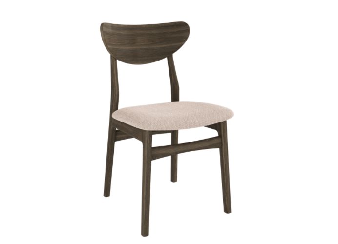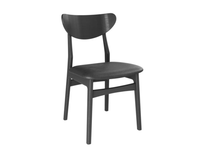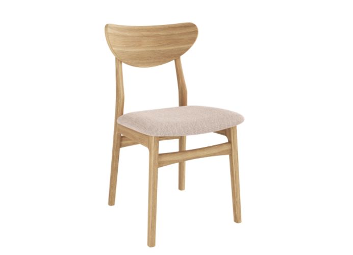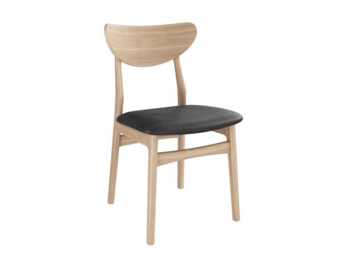 De stoel is gemaakt van eikenhout en verkrijgbaar met drie verschillende zittingopties, in stof of leder: