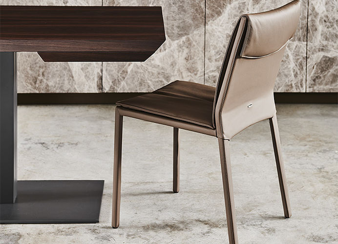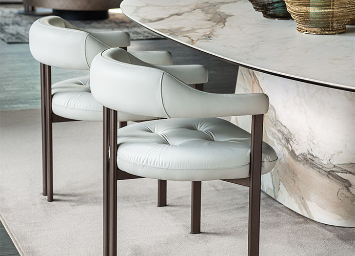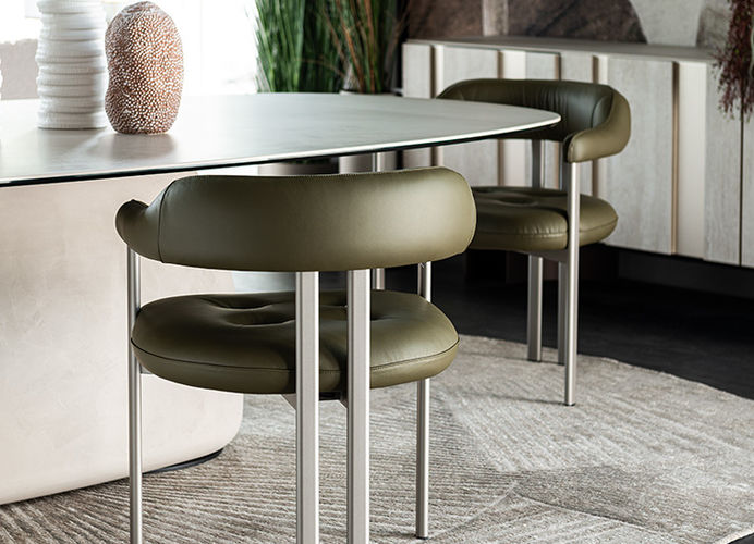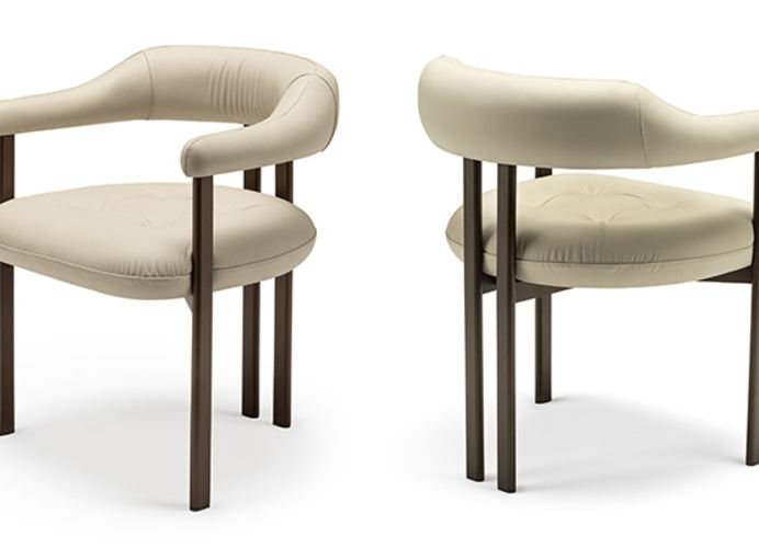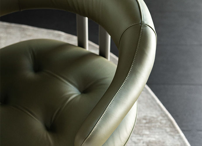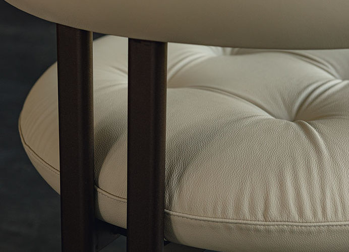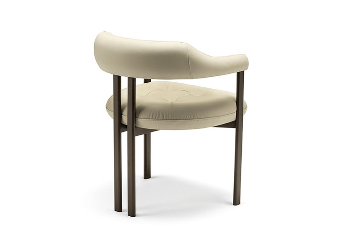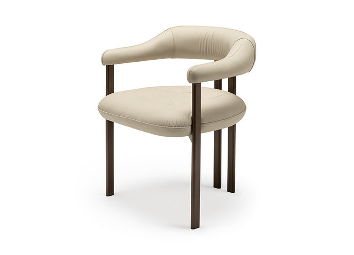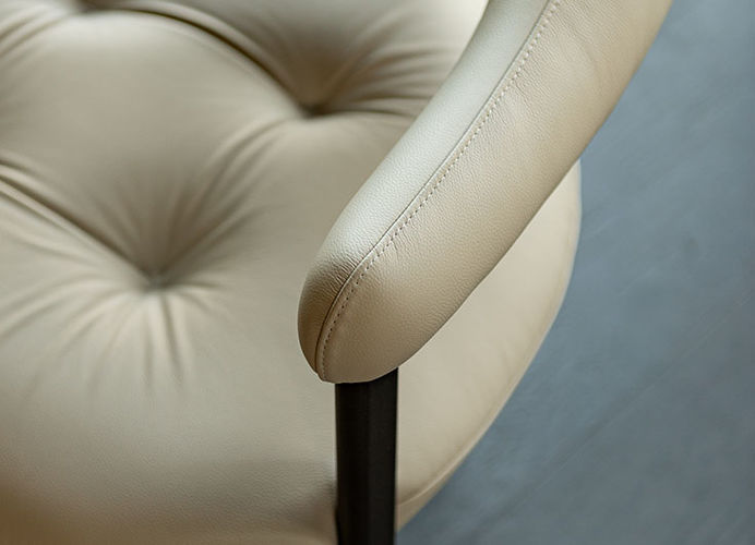 Het royale zitkussen loopt vloeiend over in de rugleuning en armleuningen en zorgt voor een hoog zitcomfort, afgewerkt met een subtiele capitonné-stikking. De slanke metalen poten geven de stoel een lichte, moderne uitstraling.