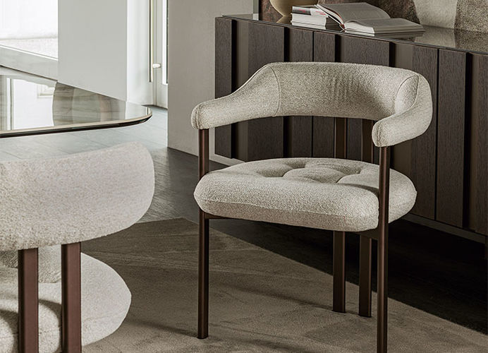 WE00973De Greta stoel is een elegante gestoffeerde stoel met armleuningen die comfort en verfijnd design combineert.