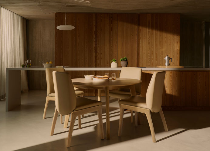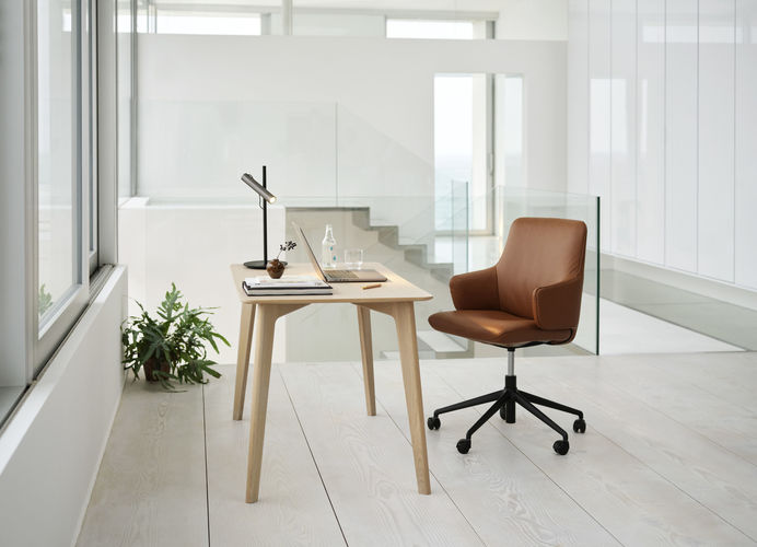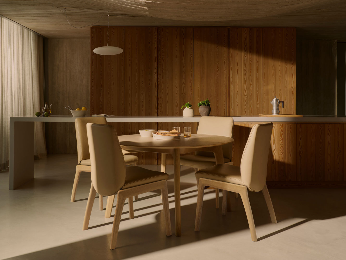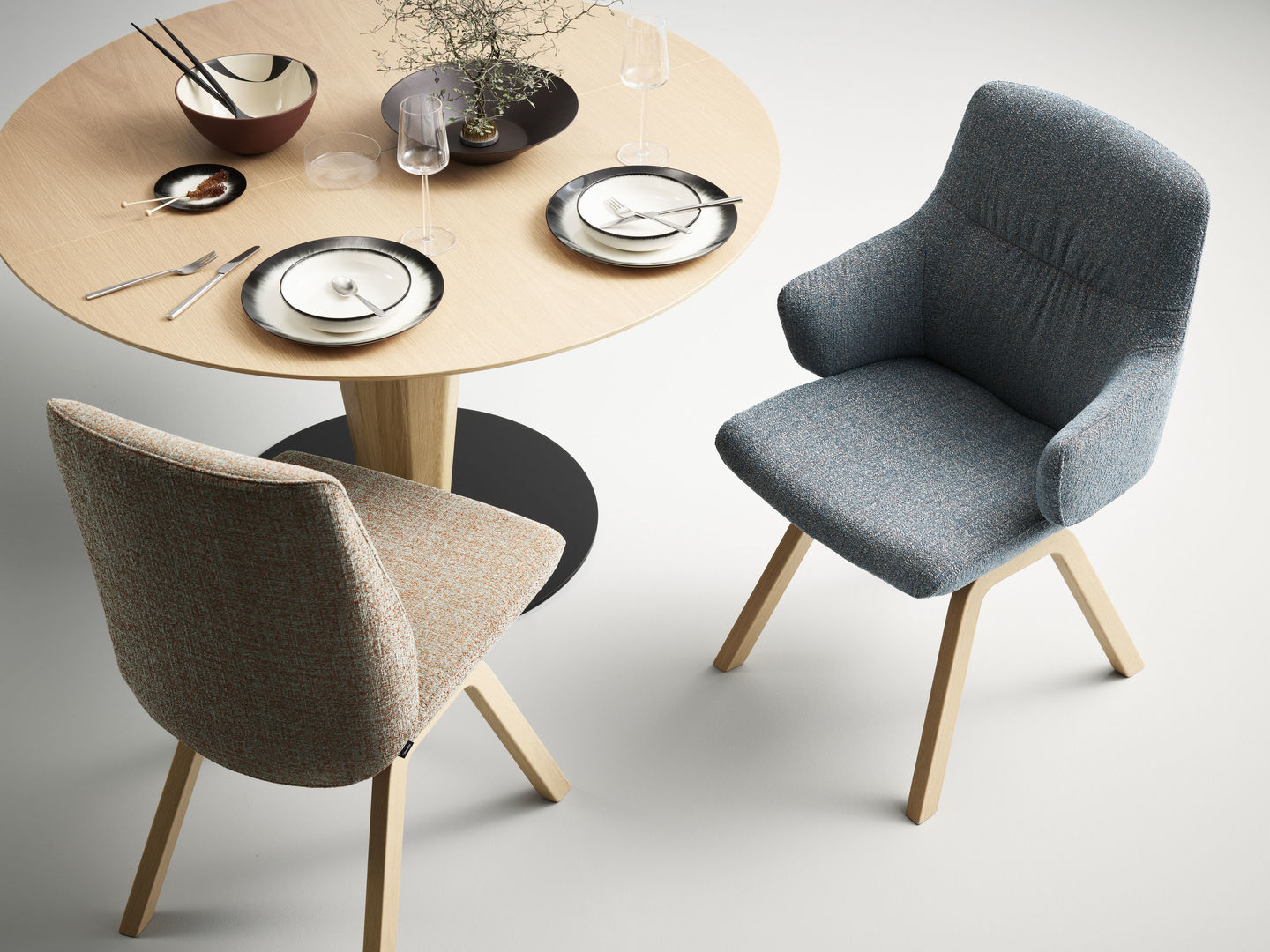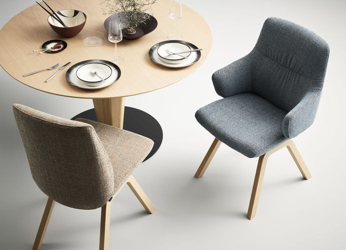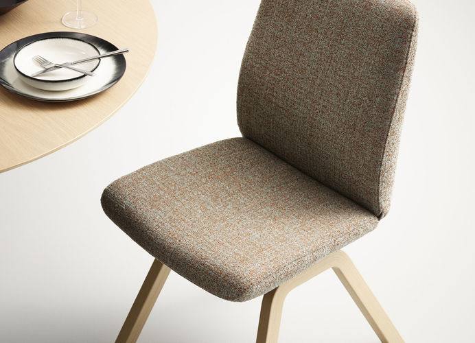 De stoel is verkrijgbaar met of zonder armleuningen, als bureaustoel, en met verschillende onderstellen in hout of metaal in diverse kleuren. De zitting kan worden uitgevoerd in stof of leder, waardoor hij perfect past bij uw interieur en lange diners of werkmomenten extra comfortabel maakt.