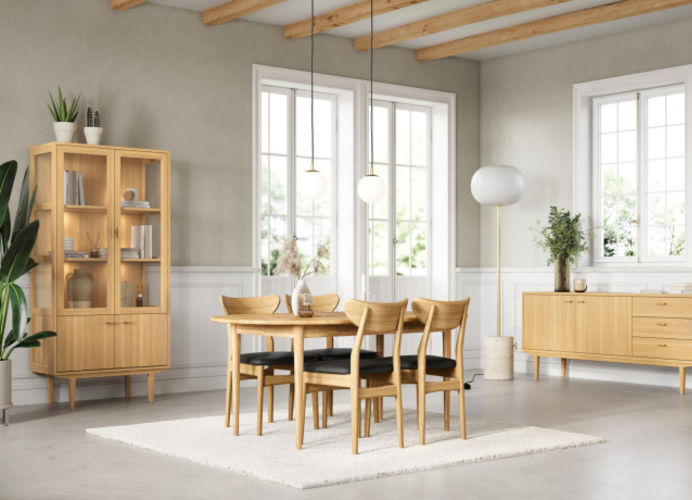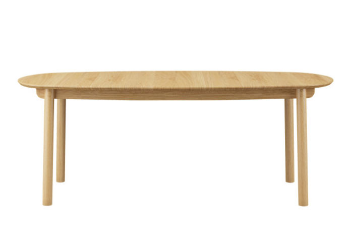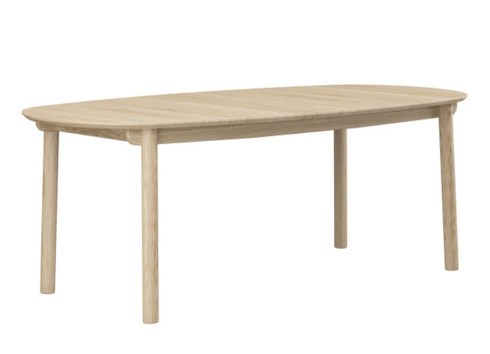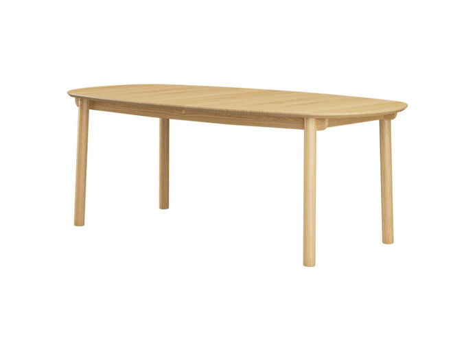 WE00894CASØ 777 eettafel is een moderne tafel van massief eiken, met zachte rondingen en een elegant design. De afgeronde hoeken, de vloeiende lijnen van het hout en de licht aflopende poten geven de tafel een vriendelijke en stijlvolle uitstraling.