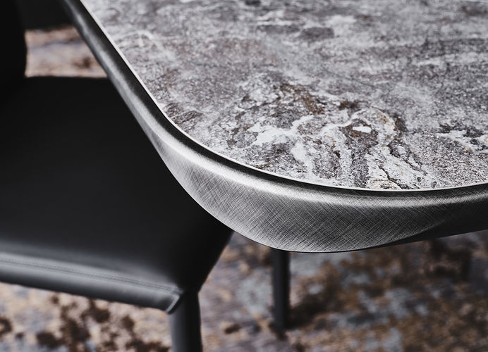 Het tafelblad is uitgevoerd in hoogwaardig keramiek met een luxueuze uitstraling, afgewerkt met een gelakte en afgeronde onderrand die het blad extra verfijnt en het design een exclusieve touch geeft.